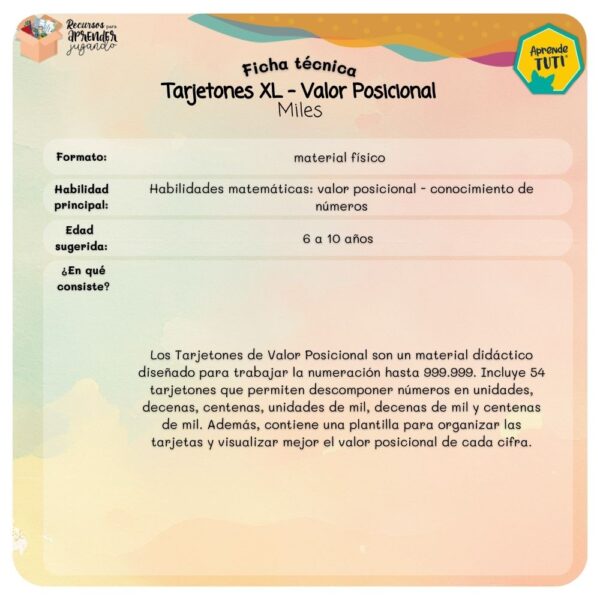 Los Tarjetones de Valor Posicional son un recurso ideal para enseñar y reforzar el concepto de valor posicional en números de hasta seis cifras (999.999). Con este material, los niños y niñas podrán comprender de manera visual y manipulativa cómo se componen y descomponen los números en unidades, decenas, centenas, unidades de mil, decenas de mil y centenas de mil.